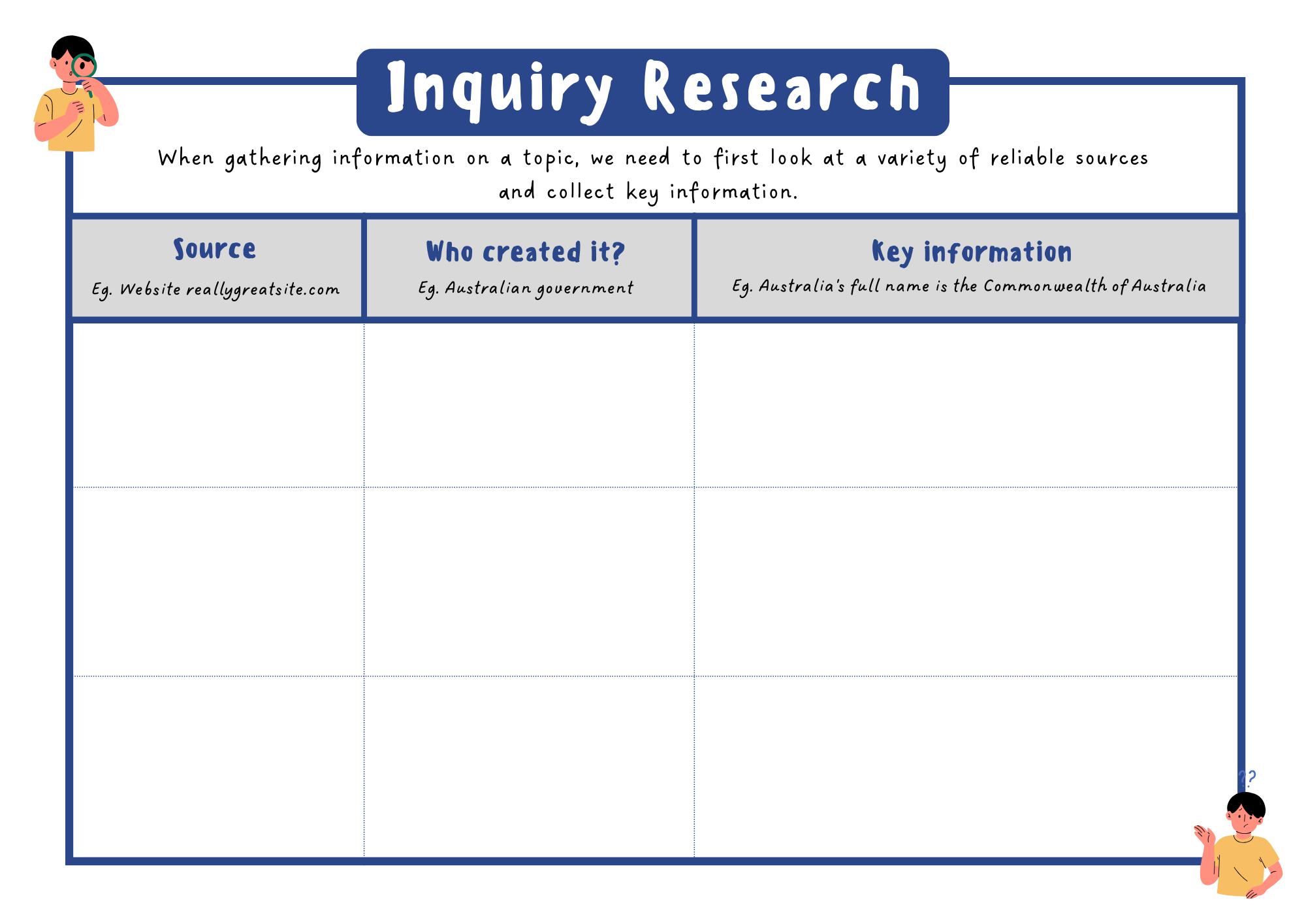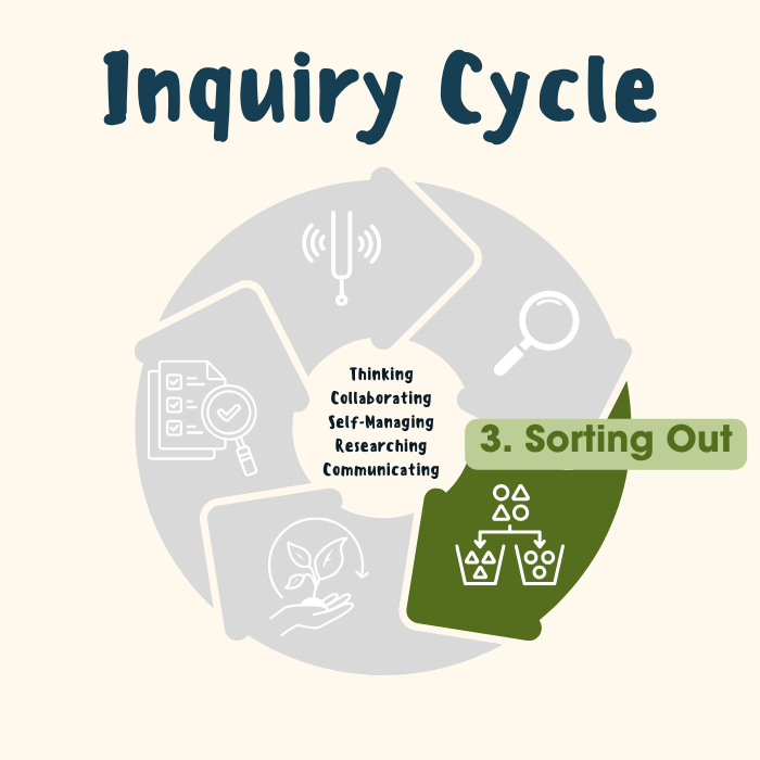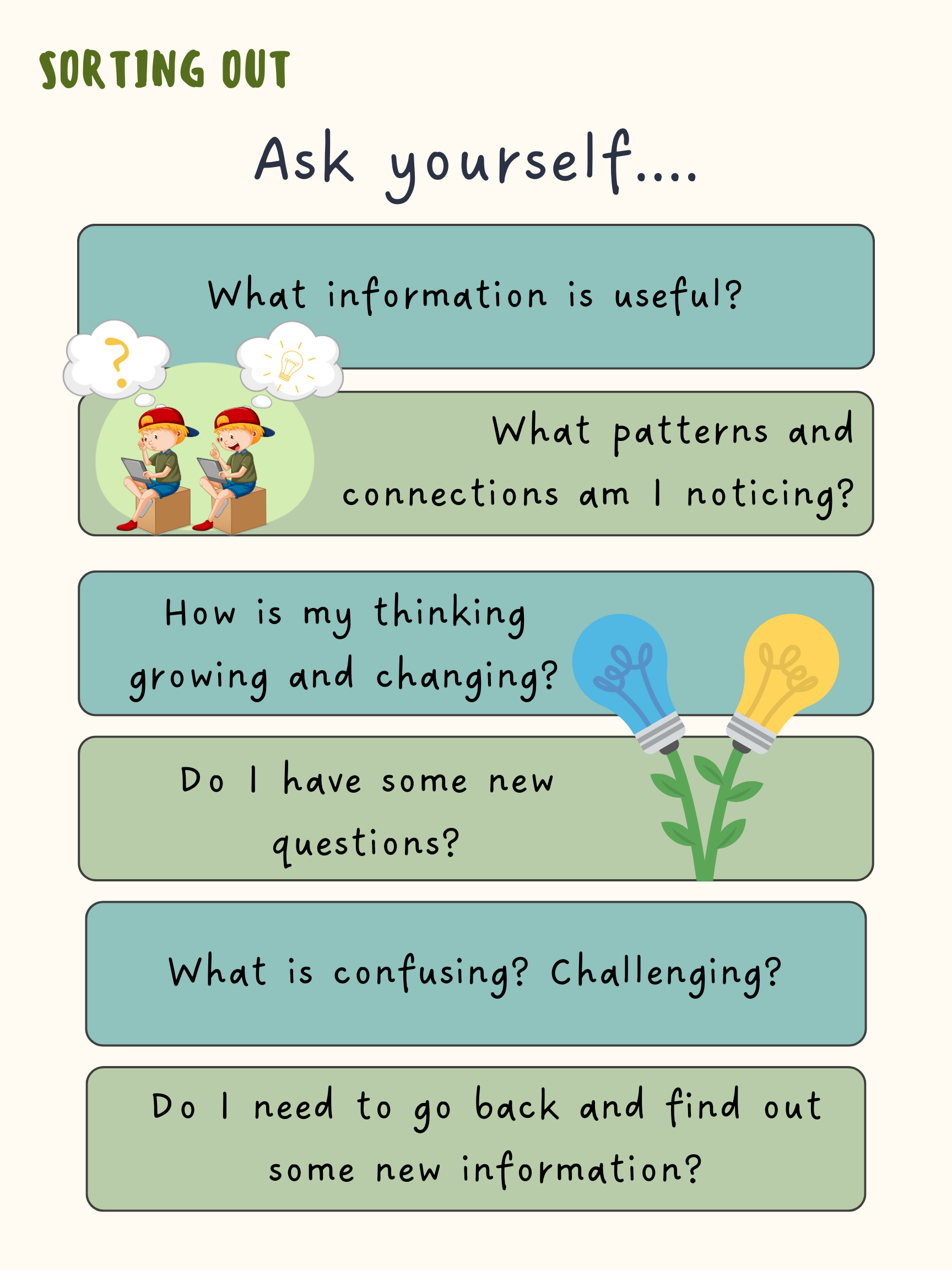 In the Sorting Out stage, students organise and categorise the information they have gathered. They use methods like mind maps, charts, and summaries to make sense of their data. Teachers help students identify key themes and connections in their research. This stage allows students to clarify their understanding, draw conclusions, and prepare for presenting their findings. It emphasises the importance of organisation and synthesis in the inquiry process. |
