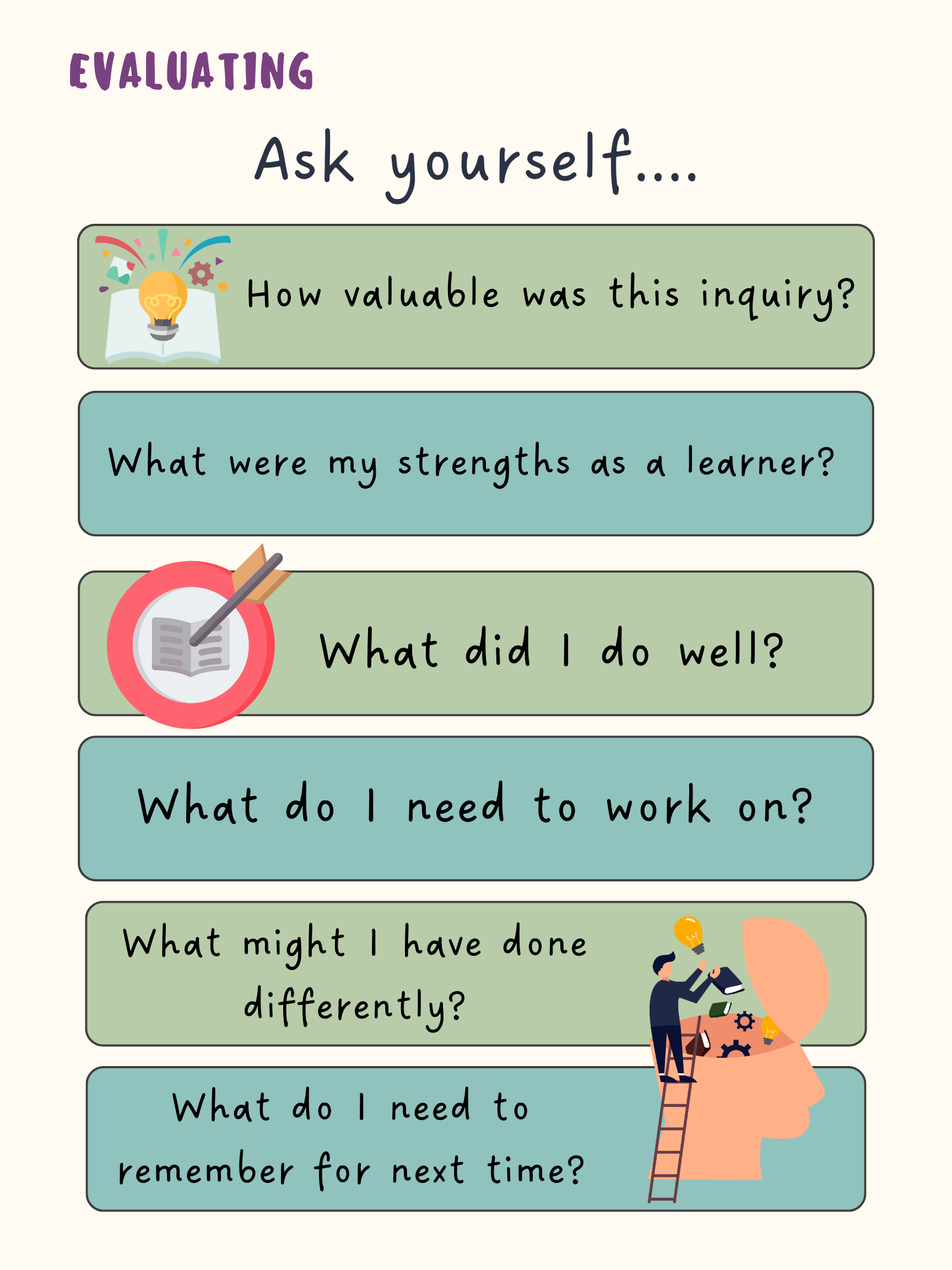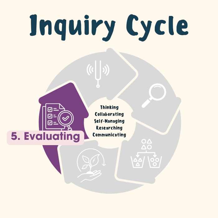 In the Evaluating stage, students assess the effectiveness of their inquiry and its outcomes. They review their research, reflect on what worked well, and identify areas for improvement. Teachers guide students in using rubrics, checklists, and peer feedback to evaluate their work. This stage emphasises critical thinking and self-assessment, helping students understand their progress and how to enhance their future inquiries. |