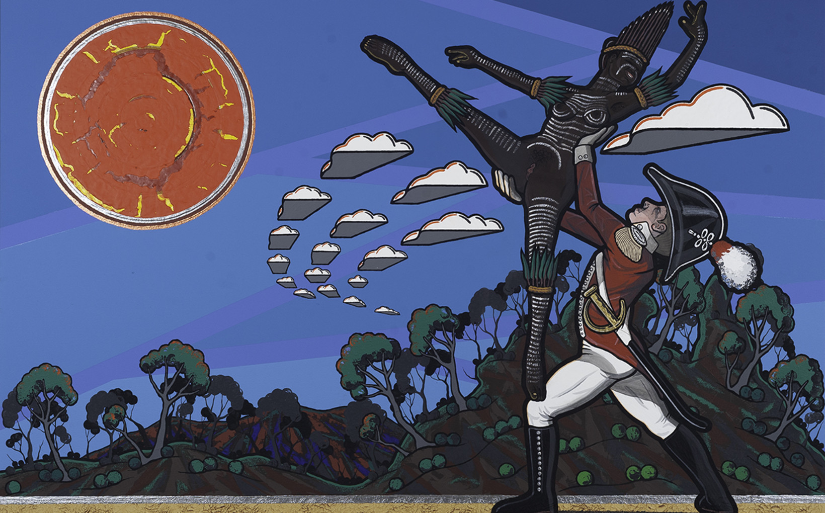 1970, the year Adam Hill was born, was a turbulent time of great change. It was time of the beginning of the Papunya Tula dot- and circle-painting movement in Central Australia, and of a major acceptance of Aboriginal art into the Australian contemporary art world. It could be seen to have begun with the painting of a mural composition, in 1971, on the side of the Papunya School building to state the sacredness of the Honey Ant Dreaming story of the site. Parallel with this major evolution was a pan-Aboriginal revolution, with those of us of mixed descent reasserting our position within the history of the nation, both past and present.