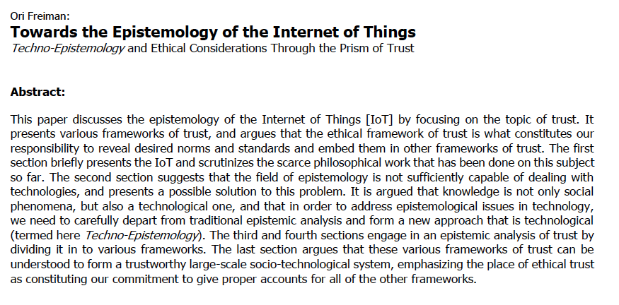 Freiman, Ori (2014). Towards the Epistemology of the Internet of Things: Techno-Epistemology and Ethical Considerations Through the Prism of Trust. International Review of Information Ethics(2):6-22. Retrieved from https://plcscotch.softlinkhosting.com.au