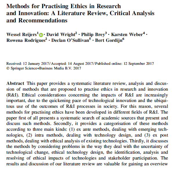 Reijers, W., Wright, D., Brey, P. et al. Methods for Practising Ethics in Research and Innovation: A Literature Review, Critical Analysis and Recommendations. Sci Eng Ethics 24, 1437–1481 . Retrieved from https://plcscotch.softlinkhosting.com.au:443/olive
