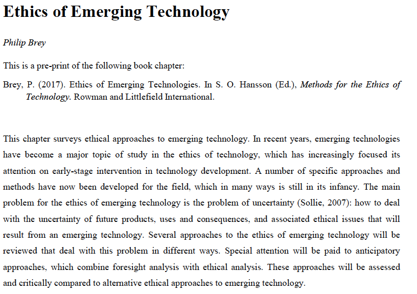 Brey, P. (2017) Ethics of Emerging Technologies In S.O. Hanson ED. Methods for the Ethics of Technology. Rowman & Littlefield International. Retrieved from https://plcscotch.softlinkhosting.com.au:443/oliver/OpacLogin?corporation=scotchplc&url=%2Fhome%2F