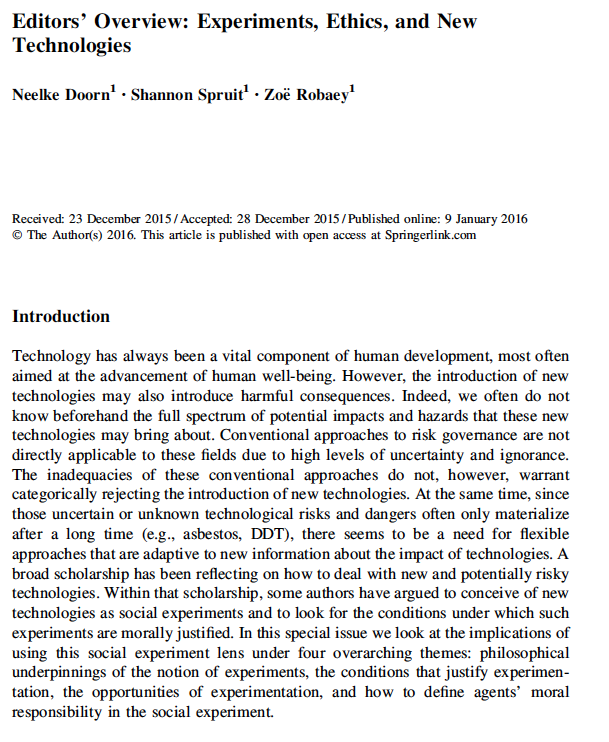 Doorn, N. Spruit, S& Robaey, Z. (2016, January). Editors Overview: Experiments, Ethics and New Technologies. Springerlink. 22 607 - 611. Retrieved from https://link.springer.com/article/10.1007/s11948-015-9748-8#citeas