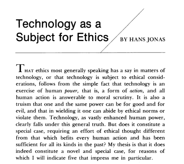 hat ethics most generally speaking has a say in matters of technology, or that technology is subject to ethical considerations, follows from the simple fact that technology is an exercise of human power, that is, a form of action, and all human action is answerable to moral scrutiny. It is also a truism that one and the same power can be for good and for evil, and that in wielding it one can abide by ethical norms or violate them. Technology, as vastly enhanced human power, clearly falls under this general truth. But does it constitute a special case, requiring an effort of ethical thought different from that which befits every human action and has been sufficient for all its kinds in the past? My thesis is that it does indeed constitute a novel and special case, for reasons of which I will indicate five that impress me in particular.