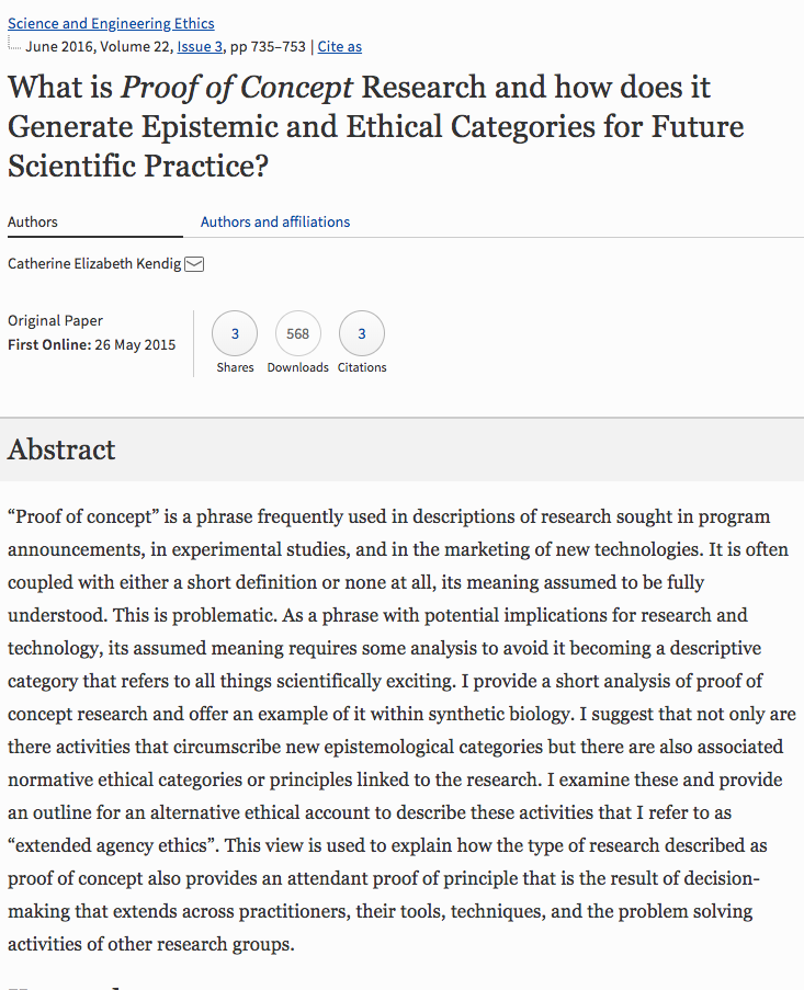 Kendig, Catherine (2015) “What is proof of concept research and how does it generate epistemic and ethical categories for future scientific practice?” Science and Engineering Ethics. DOI:10.1007/s11948- 015-9654-0 Retrieved from https://plcscotch.softlinkhosting.com.au/oliver/home/resources/details/e121115e0a0000a66b8008250041b65a